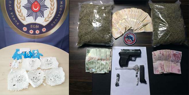 Bursa'da, emniyet ekiplerinin düzenlediği operasyonlarda 6 kiloya yakın uyuşturucu ele geçirilirken, çok sayıda şüpheli gözaltına