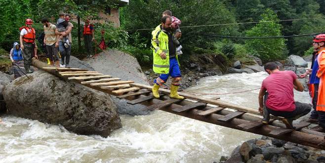 Rize'de akşam saatlerinde etkili olan şiddetli yağış nedeniyle su düzeyi yükseldi. Taşan dere yaya köprüsünün