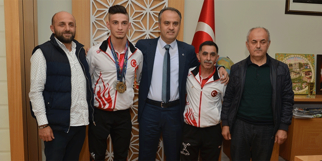 Yıldızlar Halter Dünya Şampiyonası'nda üçüncülük kürsüsüne çıkan İnegöl Belediyesporlu Ferhat Ali Yazıcı'yı, Başkan Alinur Aktaş