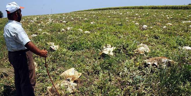 Osmaniye'de karpuz üreticileri, tarladaki ürünlerini aşırı sıcaklardan zarar görmemesi için gazetelere sararak korumaya çalışıyor.