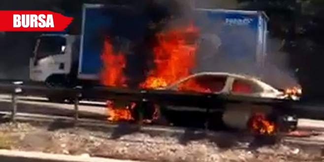 Bursa’da, İstanbul yolu üzerinde seyir halindeyken tutuşan otomobil yol ortasında alev alev yandı.