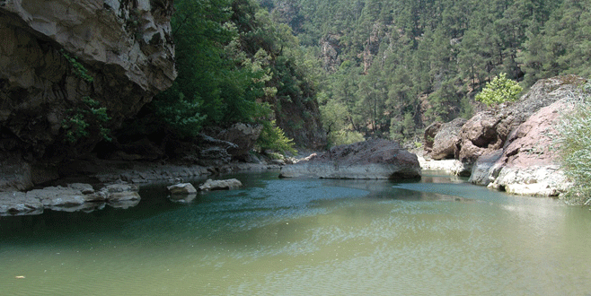 Bursa'nın Orhaneli ilçesindeki ‘Sadağı Kanyonu Tabiat Parkı', sarp kayalıkları, sıcak su kaynağı, kaya hamamı ve