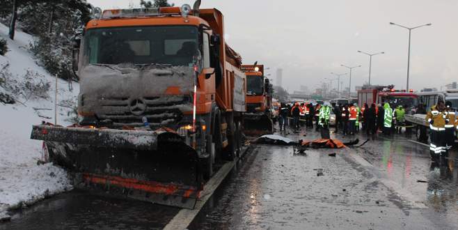TEM Otoyolu Ümraniye mevkisinde, kontrolden çıkan bir otomobilin Karayolları Genel Müdürlüğünün karla mücadele ekiplerine çarpması