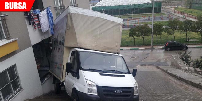 Bursa'da yokuş yukarı çıkarken geri kayan yük dolu kamyonet bir evin cam balkonundan içeriye girdi.