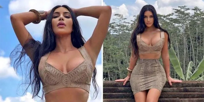 Cesur pozlarıyla sık sık adından söz ettiren Kim Kardashian bu sefer de gümüş rengi mayosuyla