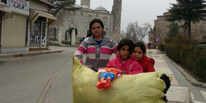 Edirne'de bir anne, iki kız çocuğuyla çuvallar içinde kirli çamaşırlarını annesinin çamaşır makinesinde yıkamak için