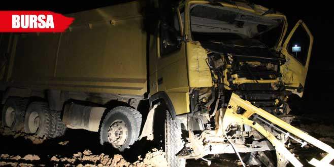 Bursa'da kırmızı ışıkta geçen TIR hafriyat kamyonuna çarptı. Yan yatan kamyonun sürücüsü hayatını kaybetti.