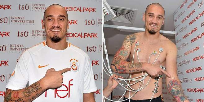 Galatasaray'ın transfer görüşmelerine başladığı Brezilyalı futbolcu Maicon Pereira Roque, sağlık kontrolü sırasında kolundaki "aslan" dövmesiyle