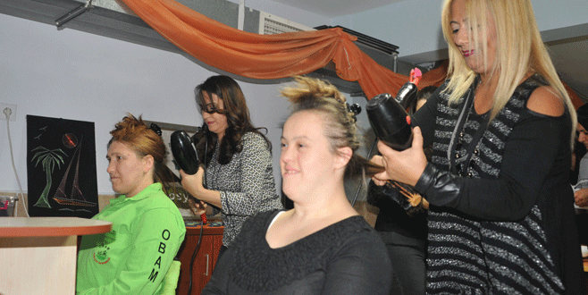 Osmangazi Belediyesi Engelli Bakım Merkezi OBAM'da eğitim gören engelli bayanlar, saç kesimi, bakımı, makyaj ve