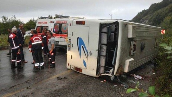 Zonguldak`ta, ünlü sanatçı Funda Arar`ın konserini izlemeye giden üniversite öğrencilerinin bulunduğu midibüs devrildi. Kazada, sürücü