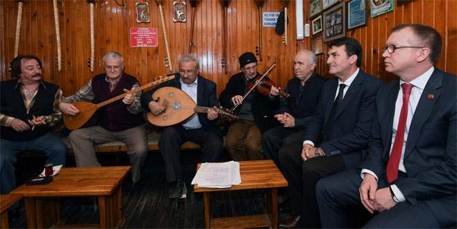 Osmangazi Belediye Başkanı Mustafa Dündar, Aşıklar Kahvesi’ni ziyaret edip, türkü söyledi.
