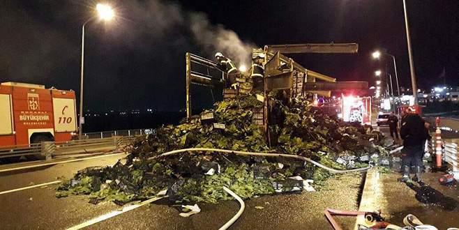 Osmangazi Köprüsü'nde seyir halindeyken alev alan üzüm yaprağı yüklü kamyon, itfaiye ekiplerince söndürüldü.