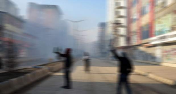 Van'da yola barikat kurarak izinsiz gösteri yapan gruba müdahale eden zırhlı polis aracına el yapımı