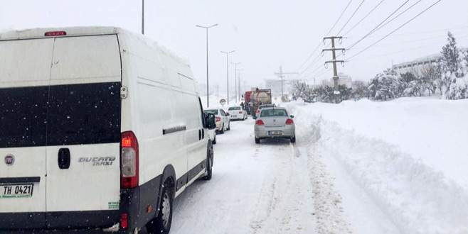 Bursa ve Balıkesir'i Çanakkale'ye bağlayan karayolunda, sabah saatlerinden bu yana etkili olan kar yağışı nedeniyle
