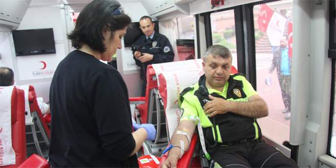 Bursa'da, trafik polisleri, Karayolları Güvenliği ve Trafik Haftası dolayısıyla kan bağışında bulundu.