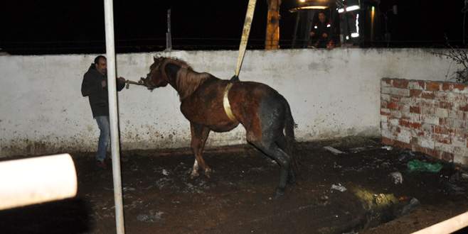 Bursa'nın İnegöl İlçesi'ndeki çiftlikte foseptik çukuruna düşen yarış atı, itfaiye ekiplerinin yoğun uğraşları sonucu kurtarıldı.