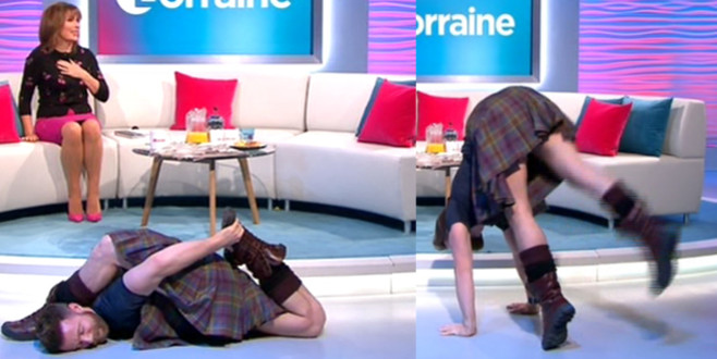 İskoçyalı yoga eğitmeni Finlar Wilson, kendi kültürüne ait kıyafetle programa çıktı. Finlar'ın etekle yaptığı yoga