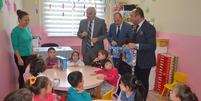 Marmarabirlik, siyah zeytin, havuçlu yeşil zeytin, zeytin ezmesi ve boyama kitabından oluşan hediye paketlerini çocuklara