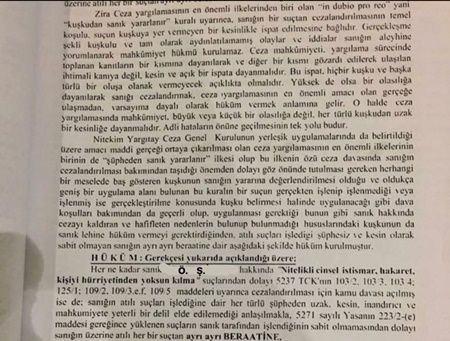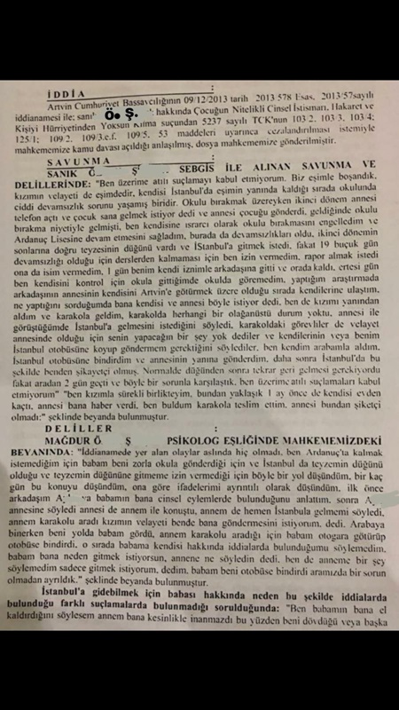 Dava kapsamında mahkemenin şikayetçi olunan babanın yanı sıra, Ö.Ş’nin yaşandığını iddia ettiği olayı anlattığı yakın arkadaşı A.G., Ö.Ş’nin babasının kız arkadaşı N.K., amcası E.Ş.’nin ifadesine başvurduğu ve daha sonra mağdurun karakolda verdiği ilk ifade ile psikolog gözetiminde verdiği ifade arasındaki çelişki ile istismar bulgusuna rastlanmayan Adlı Tıp raporunu da değerlendirerek babanın her bir suçtan ayrı ayrı beraatine karar verdiği ortaya çıktı.