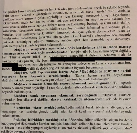 “Olayın bu denli büyüyeceğini düşünmeden hareket etmiştir. Kendisinin kollarında bıçak izleri vardır. Bunları o dönem kendisinin yaptığını söylemiştir.”