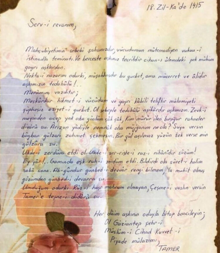 Çevresini yaktığı mektupta, Osmanlıca olarak Arzu Balkan’a duygularını anlatan Karadağlı, mektubu yazarken Gaziantep Orduevi’nin kütüphanesindeki kitaplardan faydalandığını belirtti.