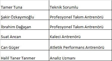 Tuna’nın teknik ekibinde Bursaspor’un eski futbolcularından antrenör İbrahim Dağaşan ve daha öncede kulüpte görev alan Şakir Özkayımoğlu ile birlikte Kondisyoner Can Güçer ve Analist Halil Taner Tarımer yer alacak.
