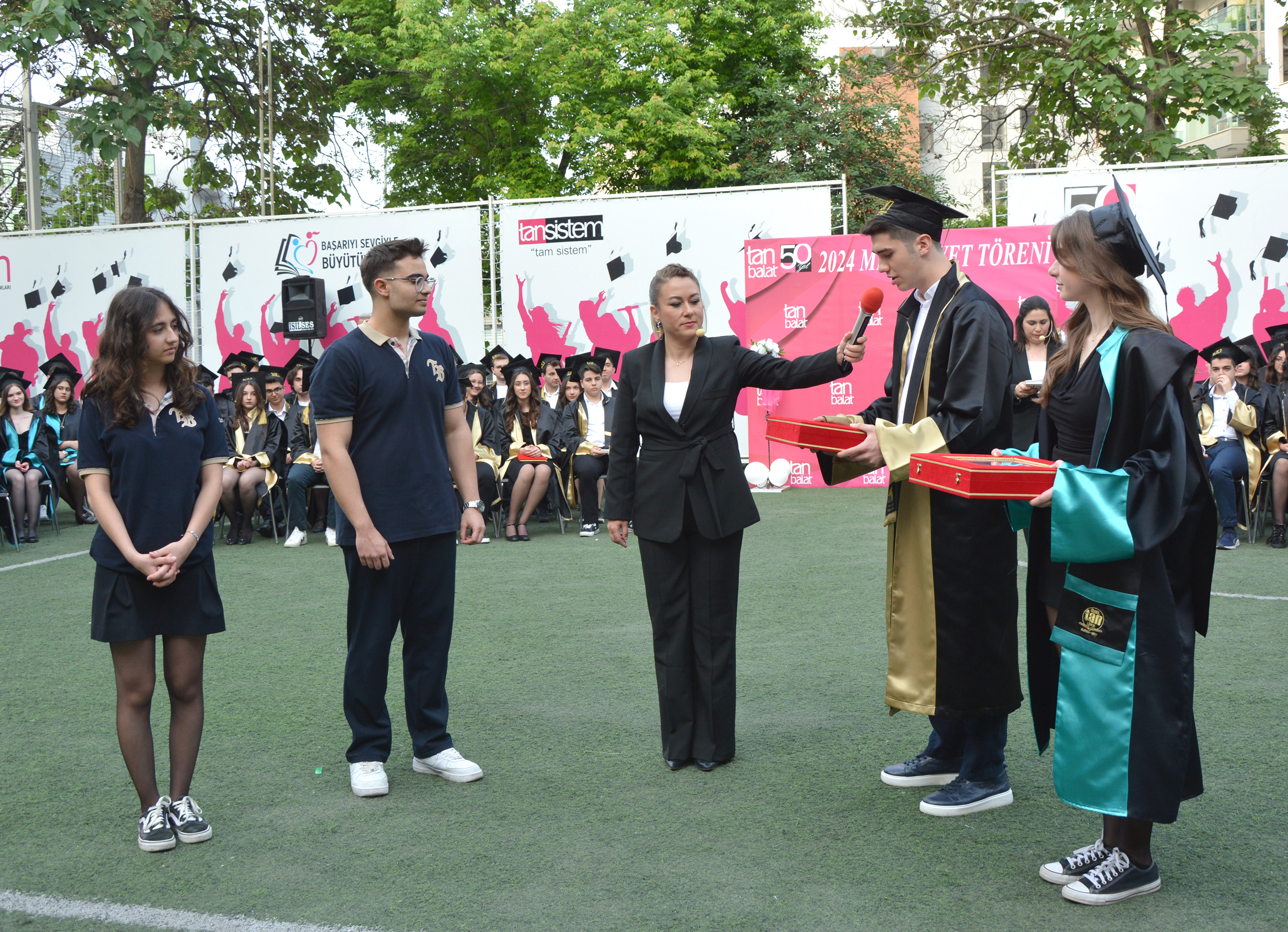 Tan Liseleri Müdürü Selda Beyazıt Tan Anadolu ve Fen Lisesi okul Birincilerini ilan ederek, başarılı öğrencileri okul kütüğüne isimlerini çakmak üzere tören alanına davet etti. Tan Fen Lisesi okul Birincisi Ozan Hisarcıklılar ve Tan Anadolu Lisesi okul Birincisi Gülin Kurutaş okul kütüğüne plaketlerini çakarak, kürsüden duygu ve düşüncelerini dile getiren konuşmalarını yaptılar.