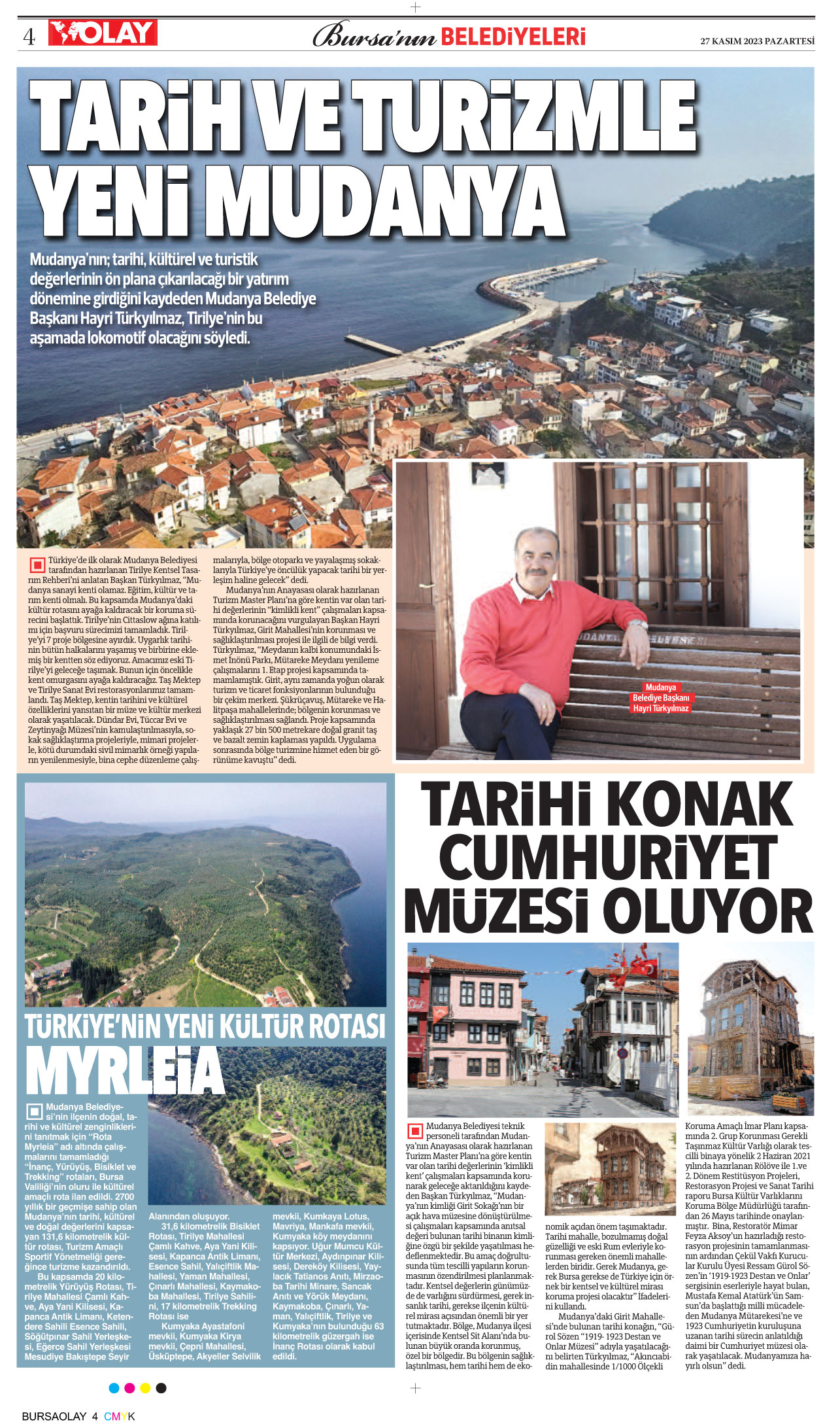 Mudanya Belediyesi’nin ilçenin doğal, tarihi ve kültürel zenginliklerini tanıtmak için “Rota Myrleia” adı altında çalışmalarını tamamladığı “İnanç, Yürüyüş, Bisiklet ve Trekking” rotaları, Bursa Valiliği’nin oluru ile kültürel amaçlı rota ilan edildi. 2700 yıllık bir geçmişe sahip olan Mudanya’nın tarihi, kültürel ve doğal değerlerini kapsayan 131,6 kilometrelik kültür rotası, Turizm Amaçlı Sportif Yönetmeliği gereğince turizme kazandırıldı.