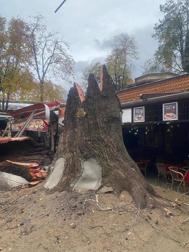 Gece yarısı büyük bir gürültüyle yıkılan dev çınar ağacı, sabah gelen esnaflar tarafından parçalara ayrılmış halde bulundu.