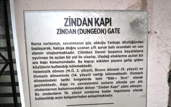 Bursa Uludağ Üniversitesi Fen-Edebiyat Fakültesi Tarih Bölümü Dr. Öğretim Üyesi Sezai Sevim, Zindan Kapı’nın Osmanlı Devleti döneminde hapishane olarak kullanıldığını ve savaş dönemlerinde zarar gördüğünü söyledi.