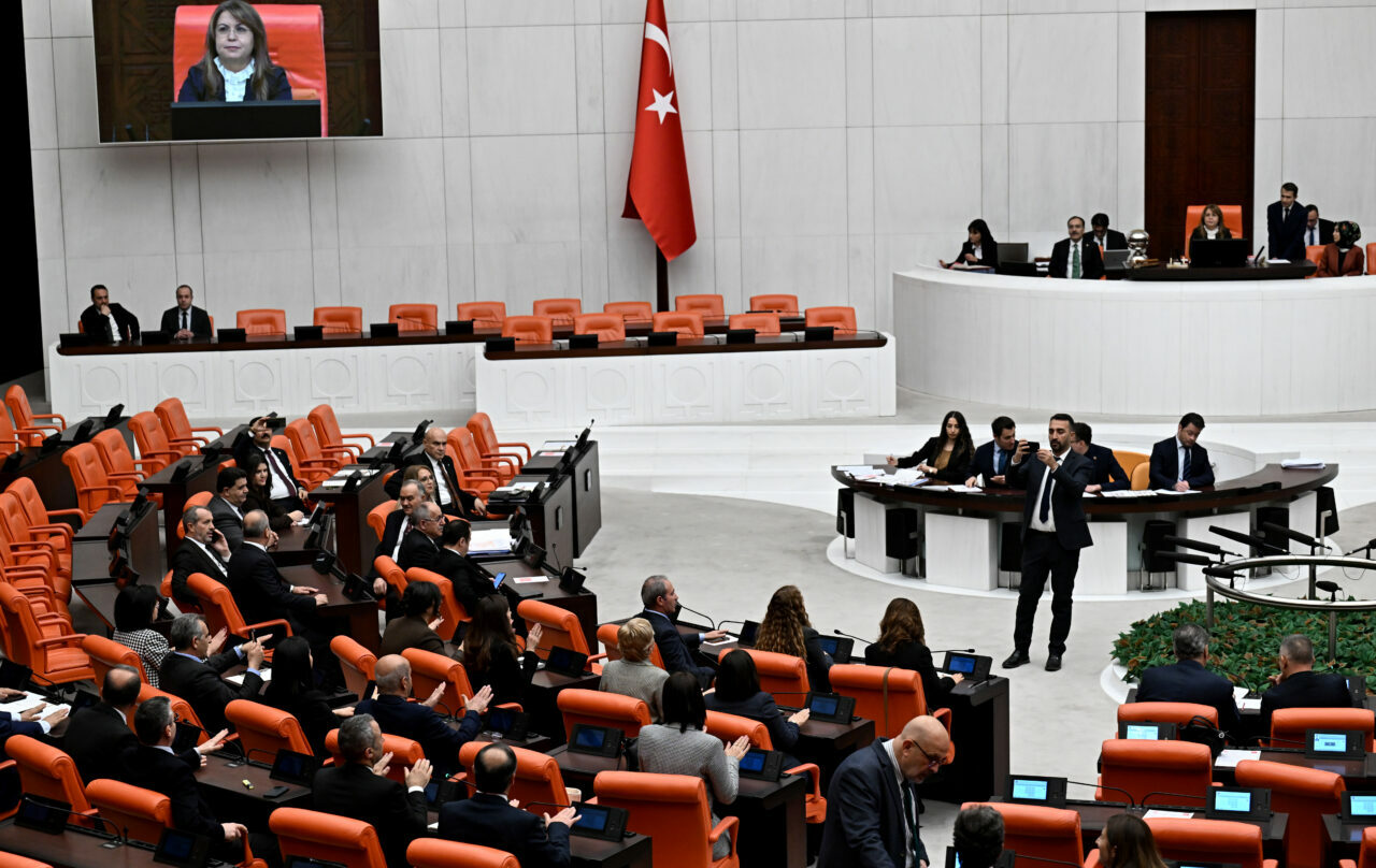 DEM Parti milletvekillerini uyaran Meclis Başkanvekili Karaca, kendisinin ve AK Parti’li Bayram’ın konuşması sırasında da DEM Parti milletvekillerinin sıralara vurmaya ve slogan atmaya devam etmeleri üzerine birleşime üç kez ara verdi.