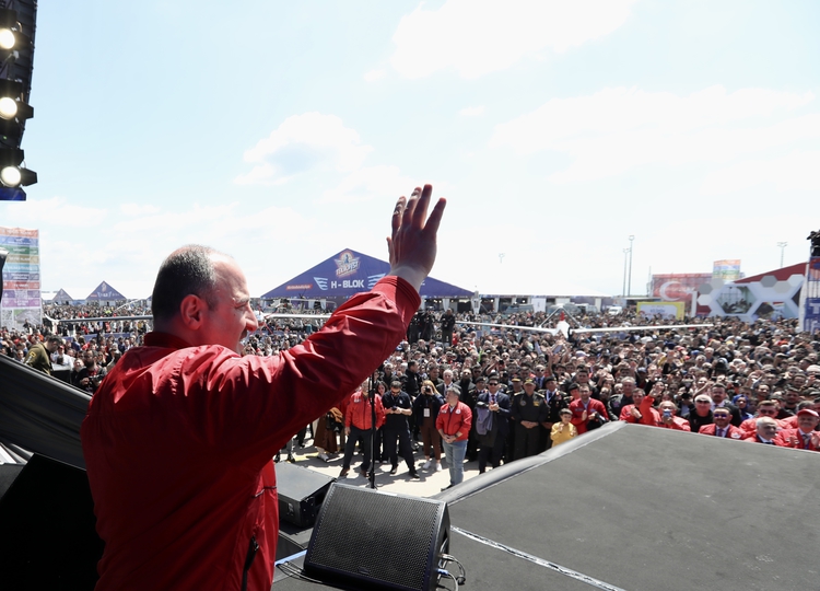 “Sizler de şahit oldunuz. Ne dediler, ‘dokunacaklarmış.’ Bir kez de buradan söyleyeyim; dokunacağız dedikleri tüm milli platformlarımıza sadece sizler, aziz milletimizin evlatları ve mazlumun yedi iklim dört kucaktaki dostları ancak dokunabilir. Bu uçaklara yalnızca tam bağımsız Türkiye hayaliyle yanıp tutuşan o güzel çocuklar gelip dokunabilir. O güzel çocuklar ki uçan kanatlarla ülkemizi, semaların da ötesine taşıyacaklar.