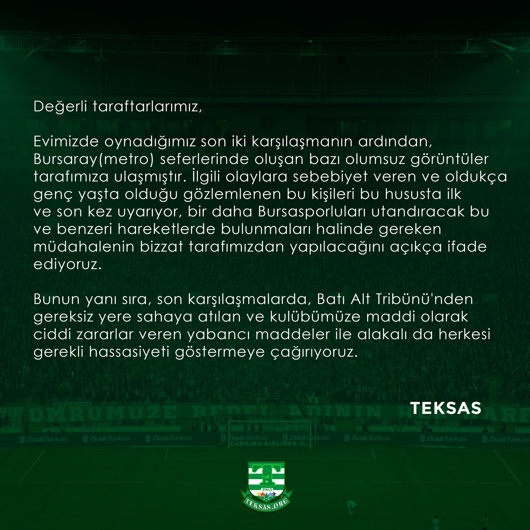 Ana Sayfa › Final › Bursaspor › Teksas’tan açıklama: ‘İlk ve son kez uyarıyoruz’Teksas’tan açıklama: ‘İlk ve son kez uyarıyoruz’ Bursaspor’un taraftar grubu Teksas’tan Bursaray’daki olumsuz görüntülerle ilgili uyarı yapıldı. Giriş: 10-10-2022 13:39Kaynak: BursasporFinal ABONE OL + - Teksas’tan yapılan açıklama şöyle: HABERİ PAYLAŞ
