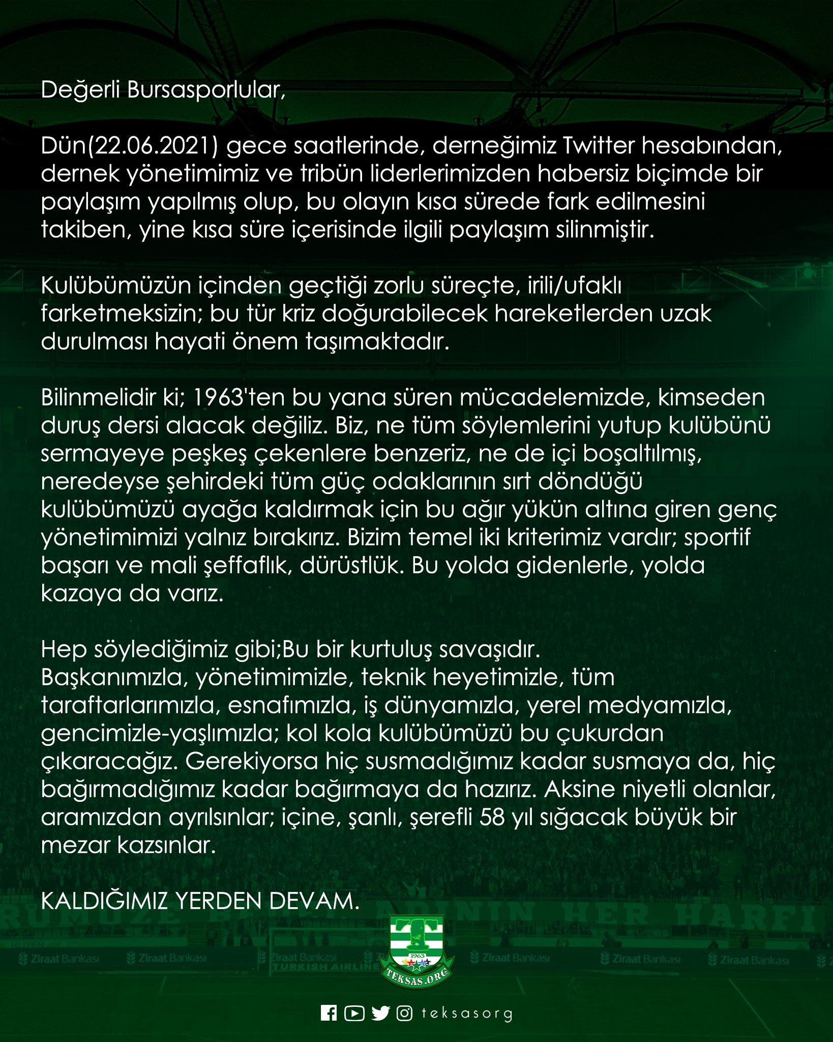 Bursaspor Taraftar Grubu Teksas’tan yapılan açıklama şu şekilde: “Değerli Bursasporlular, Dün (22.06.2021) gece saatlerinde, derneğimiz Twitter hesabından, dernek yönetimimiz ve tribün liderlerimizden habersiz biçimde bir paylaşım yapılmış olup, bu olayın kısa sürede fark edilmesini takiben, yine kısa süre içerisinde ilgili paylaşım silinmiştir. Kulübümüzün içinden geçtiği zorlu süreçte, irili/ufaklı farketmeksizin; bu tür kriz doğurabilecek hareketlerden uzak durulması hayati önem taşımaktadır. Bilinmelidir ki; 1963’ten bu yana süren mücadelemizde, kimseden duruş dersi alacak değiliz. Biz, ne tüm söylemlerini yutup kulübünü sermayeye peşkeş çekenlere benzeriz, ne de içi boşaltılmış, neredeyse şehirdeki tüm güç odaklarının sırt döndüğü kulübümüzü ayağa kaldırmak için bu ağır yükün altına giren genç yönetimimizi yalnız bırakırız. Bizim temel iki kriterimiz vardır; sportif başarı ve mali şeffaflık, dürüstlük. Bu yolda gidenlerle, yolda kazaya da varız.”