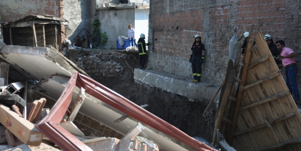 Yaşanan yıkılma sonucunda temel alanının yanındaki 5 katlı apartmanda çatlaklar oluştu.