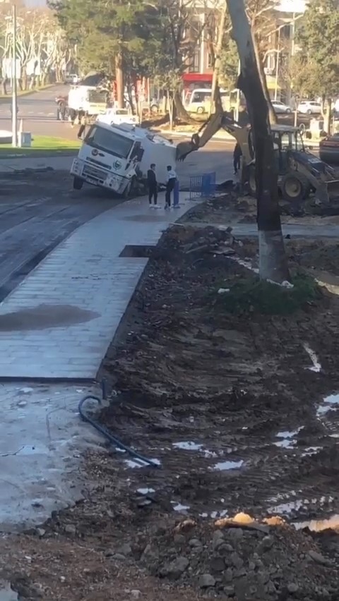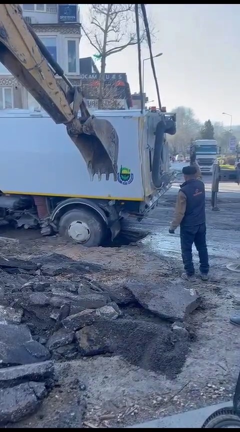 Kazı çalışması yapılan alanın yanından geçen temizlik kamyonunun ağırlığını kaldıramayan yol çöktü. Arka tekerleri çukurda kalan kamyon iş makineleri ve vinç yardımı ile bulunduğu yerden çıkarıldı. Yaşanan olayda yaralanan olmadı.