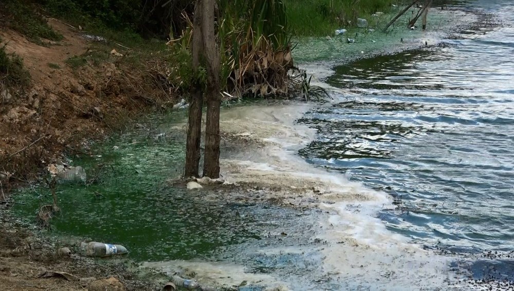 Gölün bir bölümün yeşile büründüren kimyasal havadan da fotoğraflandı.