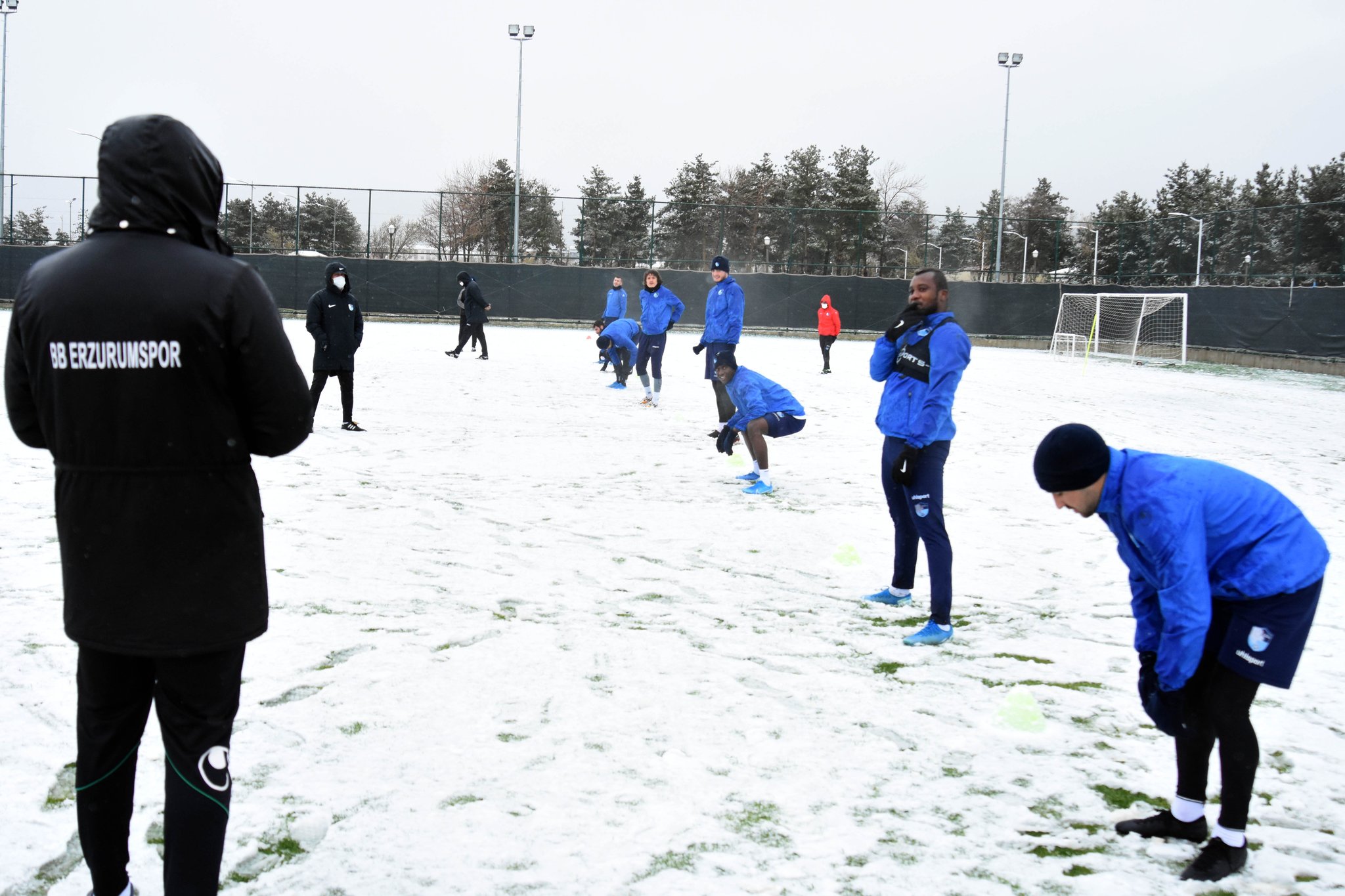 TFF 1. Lig ekiplerinden Büyükşehir Belediye Erzurumspor, yeni tip koronavirüs (Kovid-19) salgını nedeniyle liglere verilen aranın ardından ilk antrenmanını kar yağışı altında yaptı.