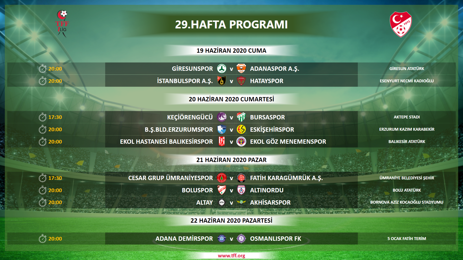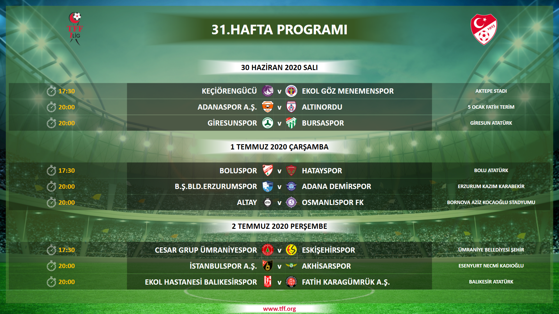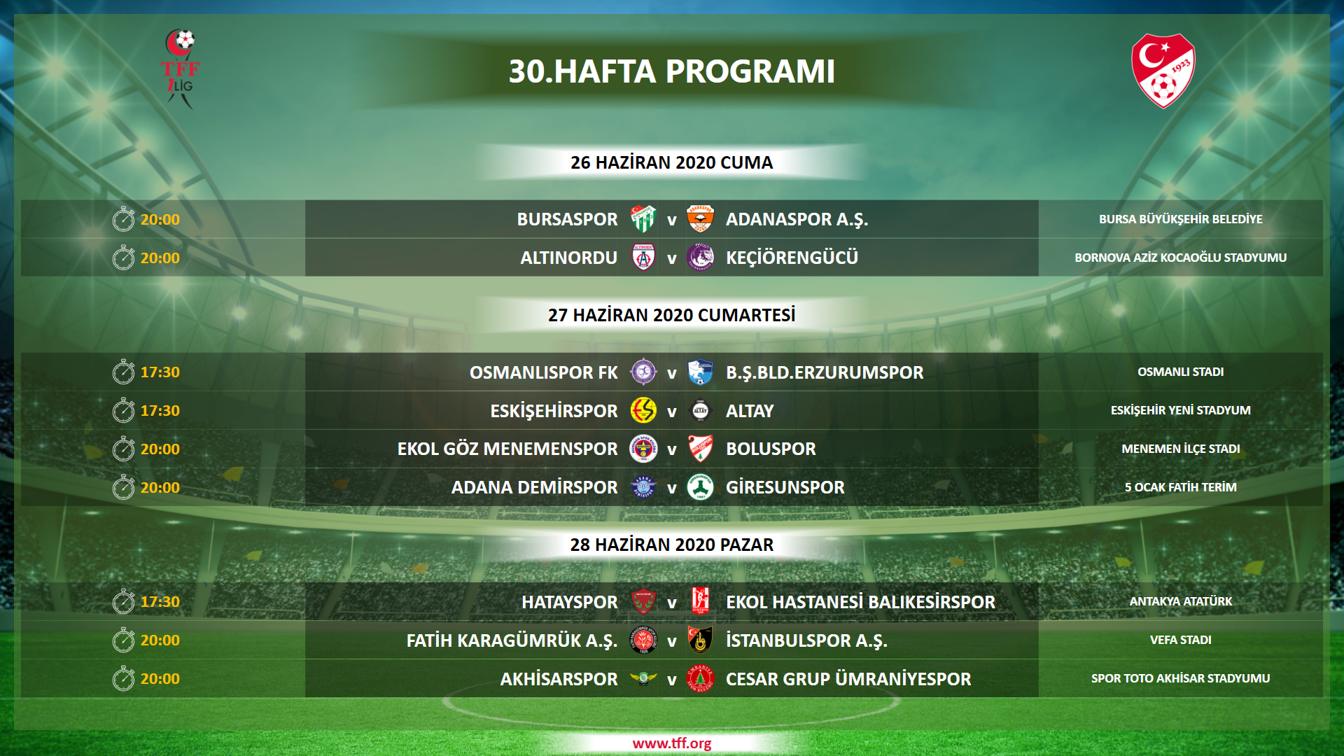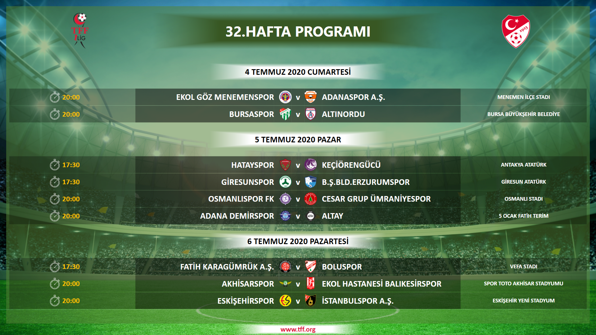 2019-2020 Sezonu TFF 1. Lig 29-32. hafta müsabaka programı açıklandı. Bursaspor’un, 29. haftadaki Keçiörengücü karşılaşması 20 Haziran Cumartesi saat 14.00’te oynanacak…