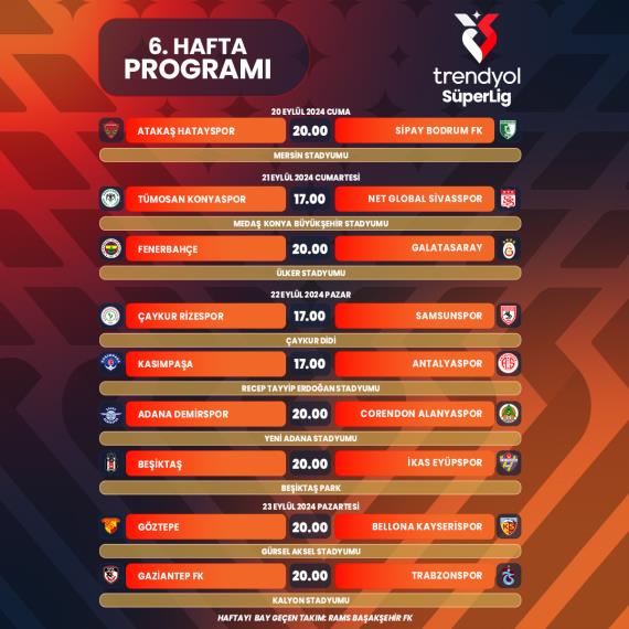 TFF’den yapılan açıklamaya göre, 6. haftada Fenerbahçe ile Galatasaray arasındaki derbi, 21 Eylül Cumartesi günü Ülker Stadı’nda saat 20.00’de yapılacak.