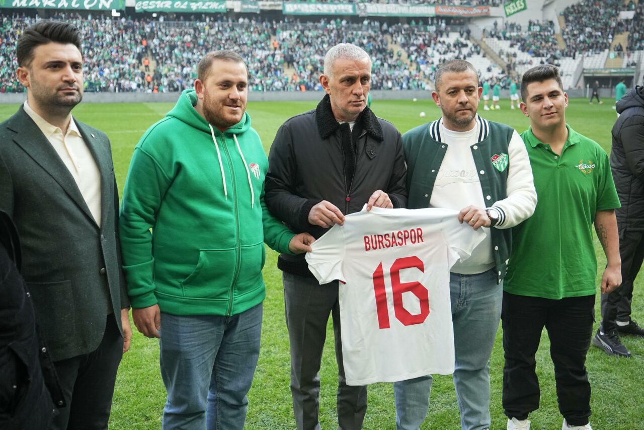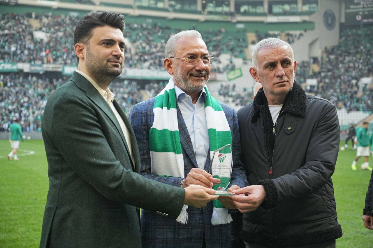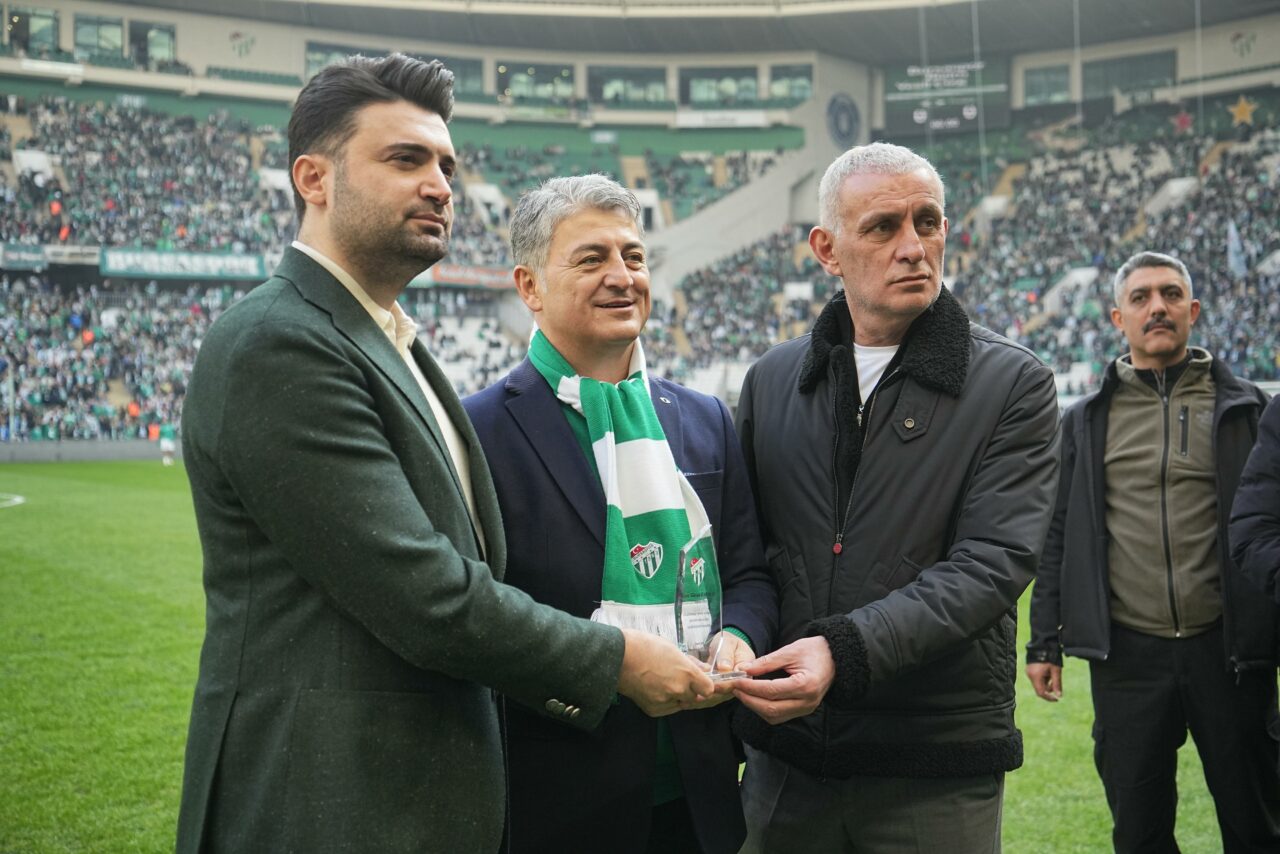 Bursaspor’un böyle bir seyirciyle yerinin Süper Lig olduğunu ifade eden Başkan Hacıosmanoğlu, “Bugün kadına karşı şiddete gösterdikleri hassasiyet nedeniyle ödül alan Bursaspor taraftarı için buradayız. Seyirciyi ve coşkuyu görüyorsunuz. Bursaspor’un yeri Süper Lig’dir. Layık olduğu yere de en kısa zamanda geleceğine inanıyoruz. Futbolla yaşayan, Süper Lig’e zamanında renk katmış çok önemli şehirlerimiz, kulüplerimiz var. Bursa’da Enes başkanımızın yaptığını onların da yapmalarını bekliyoruz. Birer tane Enes başkan gibi çıkarmalarını temenni ediyorum. Camialarını bütünleştirecek birer tane Enes Başkan nasip etsin hepsine” dedi.
