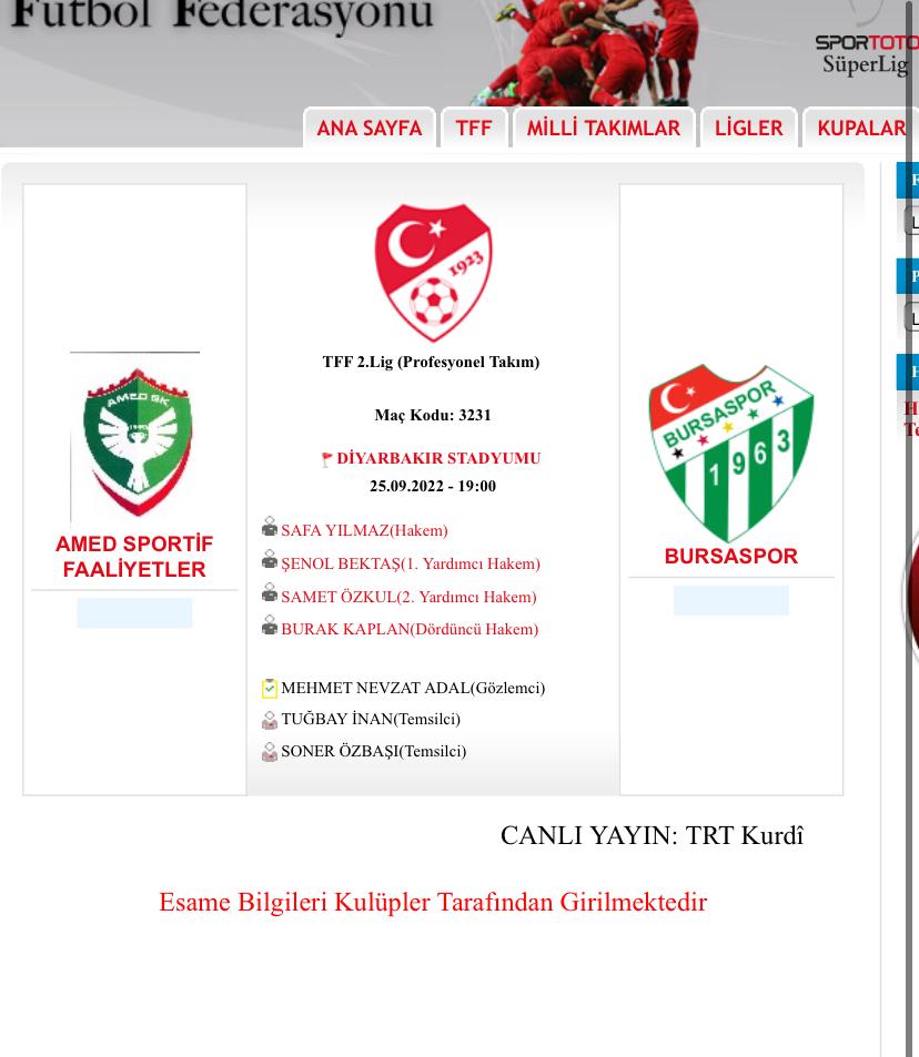 Buna karşın Türkiye Futbol Federasyonu’nun resmi sitesinden dün sabah yapılan paylaşımda Amed-Bursaspor maçının canlı yayınlanacağı belirtilmişti…
