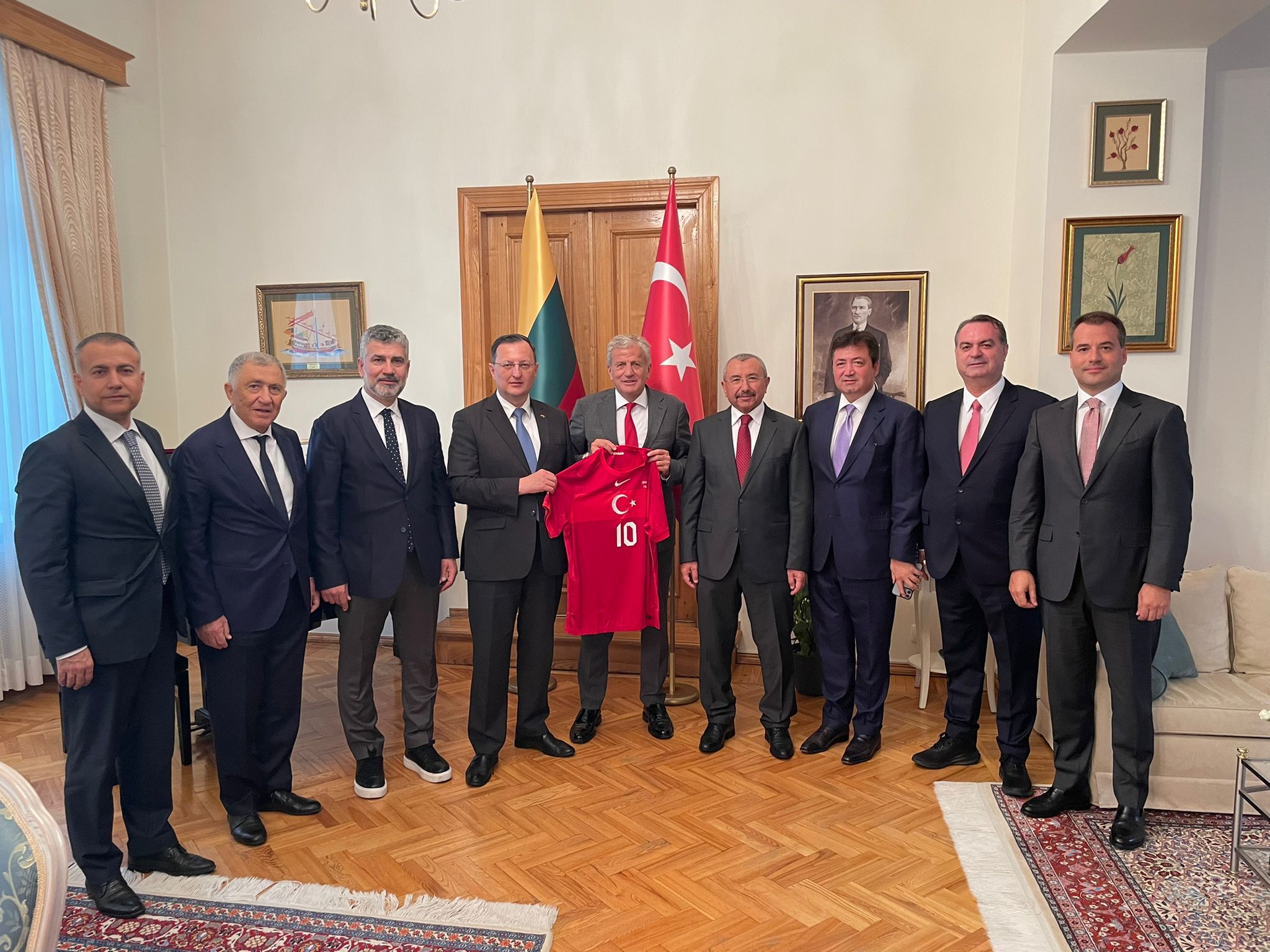 T.C. Vilnius Büyükelçiliği’nde gerçekleşen nezaket ziyaretine; TFF Başkan Vekilleri ve İcra Kurulu Üyeleri Mustafa Çağlar ve Yılmaz Büyükaydın, Yönetim Kurulu Üyeleri İsmail Erdem ve Nuri Akın, TFF Genel Sekreteri Kadir Kardaş ile Litvanya İstanbul Fahri Konsolosu Sarper Cengiz katıldı.