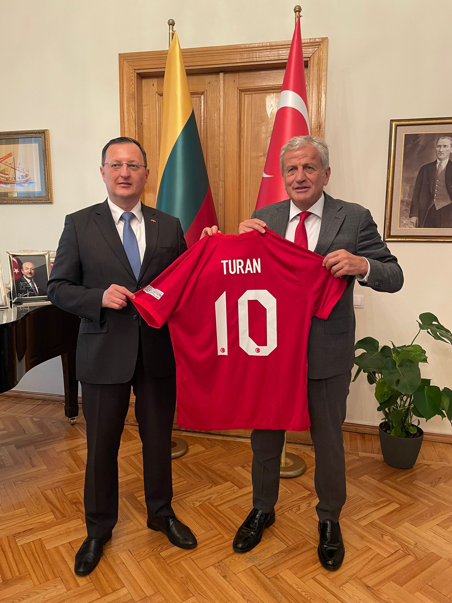 A Milli Takımımızın Litvanya ile oynayacağı UEFA Uluslar Ligi maçı için bu ülkede bulunan Türkiye Futbol Federasyonu Başkanı Servet Yardımcı ile Yönetim Kurulu üyeleri T.C. Vilnius Büyükelçisi Gökhan Turan’ı ziyaret etti.