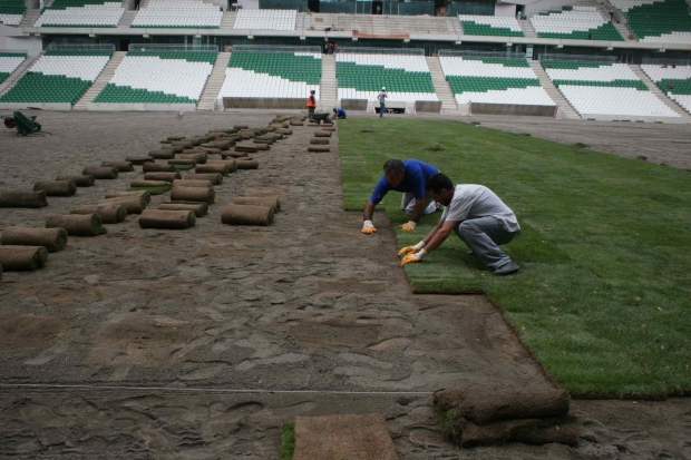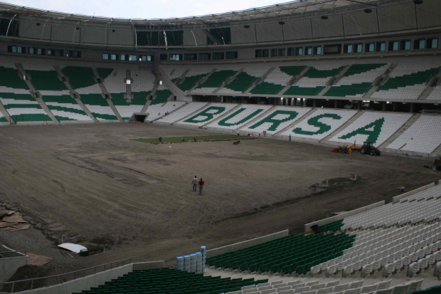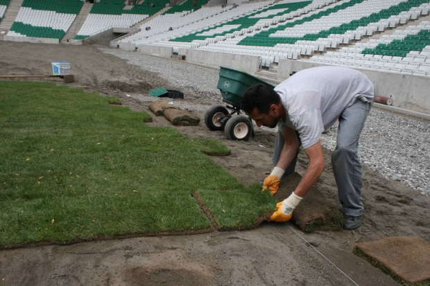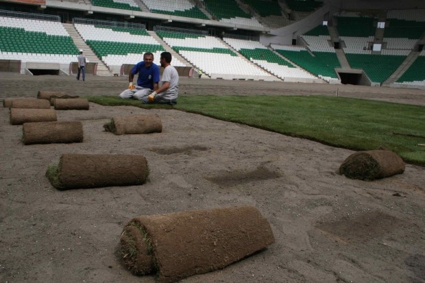 Bursa Büyükşehir Belediyesi tarafından yaptırılan ve yaklaşık 185 bin metrekarelik inşaat alanına sahip olan yeni stadyumunda çalışmalar son aşamaya geldi. Özlüce Tesisleri’nde dün kesilmeye başlanan çimler sabah saatlerinden itibaren Timsah Arena’ya özel araçlarla getirildi. 16 bin parça halinde taşınacak çimler, günde bin metrekare serilerek bir hafta içinde bitirilmesi hedefleniliyor.
