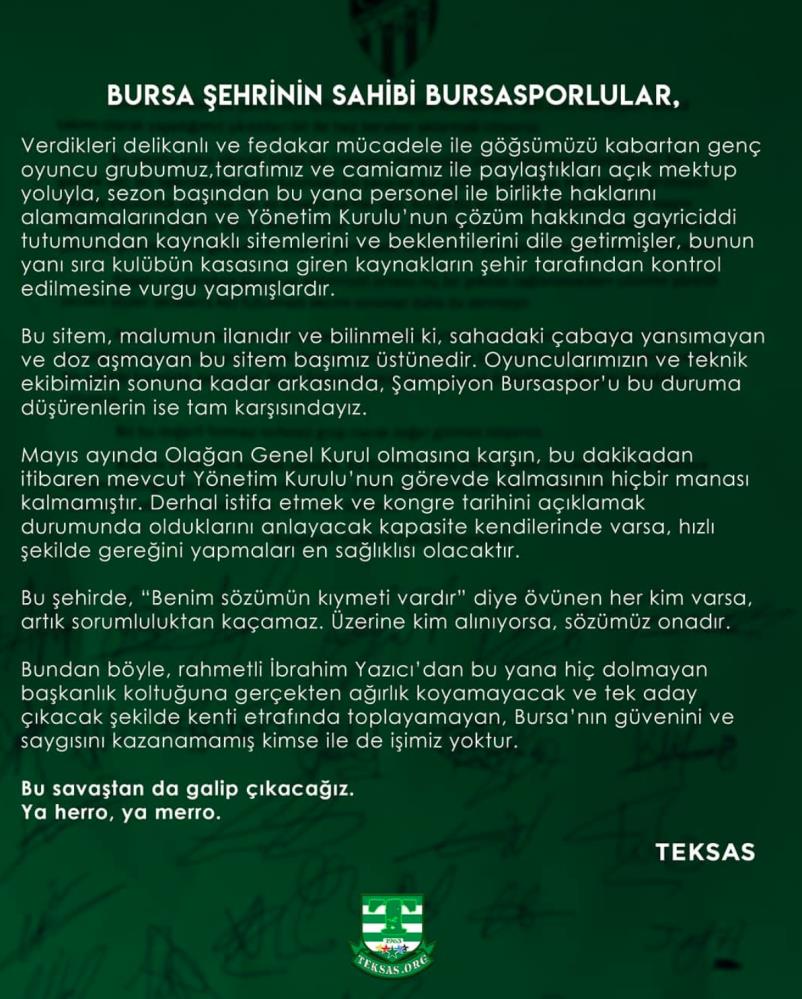 “Bursa şehrinin sahibi Bursasporlular, verdikleri delikanlı ve fedakar mücadele ile göğsümüzü kabartan genç oyuncu grubumuz, tarafımız ve camiamız ile paylaştıkları açık mektup yoluyla, sezon başından bu yana personel ile birlikte haklarını alamamalarından ve Yönetim Kurulu’nun çözüm hakkında gayriciddi tutumundan kaynaklı sitemlerini ve beklentilerini dile getirmişler, bunun yanı sıra kulübün kasasına giren kaynakların şehir tarafından kontrol edilmesine vurgu yapmışlardır. Bu sitem, malumun ilanıdır ve bilinmeli ki, sahadaki çabaya yansımayan ve doz aşmayan bu sitem başımız üstünedir. Oyuncularımızın ve teknik ekibimizin sonuna kadar arkasında, şampiyon Bursaspor’u bu duruma düşürenlerin ise tam karşısındayız. Mayıs ayında Olağan Genel Kurul olmasına karşın, bu dakikadan itibaren mevcut Yönetim Kurulu’nun görevde kalmasının hiçbir manası kalmamıştır. Derhal istifa etmek ve kongre tarihini açıklamak durumunda olduklarını anlayacak kapasite kendilerinde varsa, hızlı şekilde gereğini yapmaları en sağlıklısı olacaktır. Bu şehirde, “Benim sözümün kıymeti vardır” diye övünen her kim varsa, artık sorumluluktan kaçamaz. Üzerine kim alınıyorsa, sözümüz onadır. Bundan böyle, rahmetli İbrahim Yazıcı’dan bu yana hiç dolmayan başkanlık koltuğuna gerçekten ağırlık koyamayacak ve tek aday çıkacak şekilde kenti etrafında toplayamayan, Bursa’nın güvenini ve saygısını kazanamamış kimse ile de işimiz yoktur. Bu savaştan da galip çıkacağız. Ya herro, ya merro.” İHA