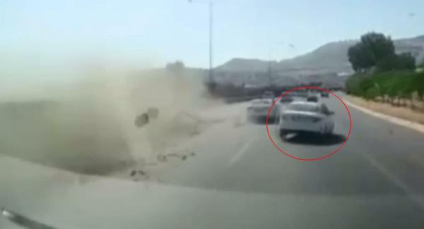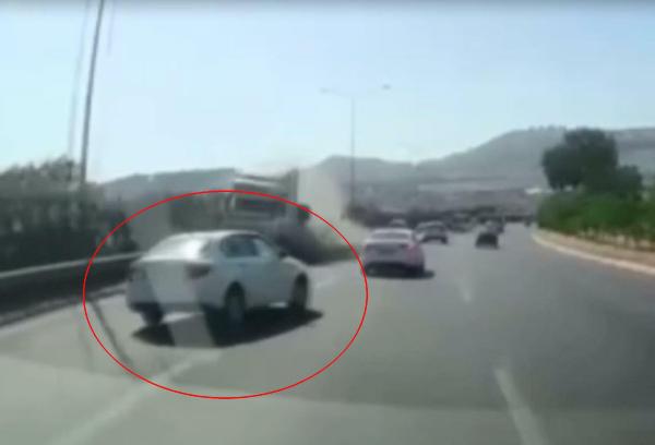 Kaza, 1 Temmuz’da saat 16.30 sıralarında Çevre Yolu Osmangazi Viyadüğü’nde meydana geldi. Bornova’dan Karşıyaka’ya giden demir yüklü TIR, ön lastiğinin patlamasıyla kontrolden çıkıp, bariyerleri aşarak karşı şeride geçti. Bu sırada TIR’ın geldiğini gören otomobil sürücüsü Hamza Can Erdönmez, manevra yapıp, son anda kurtuldu. Ölen ya da yaralananın olmadığı kaza anı, arkadan gelen başka otomobilin araç kamerasınca görüntülendi. TIR’ın dorsesinden yola saçılan demirler, bölgeye gelen ekiplerce toplandı. Polis, kazayla ilgili soruşturma başlattı.