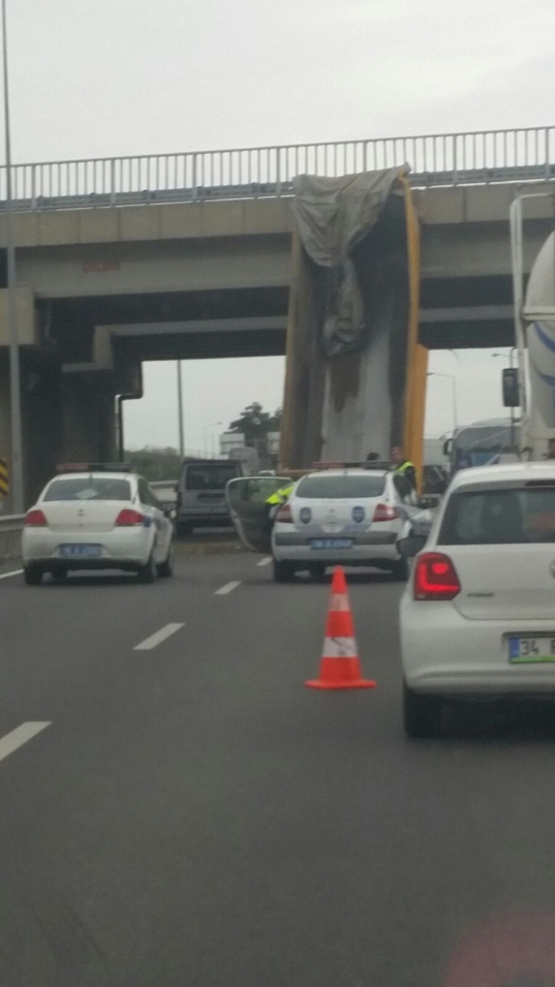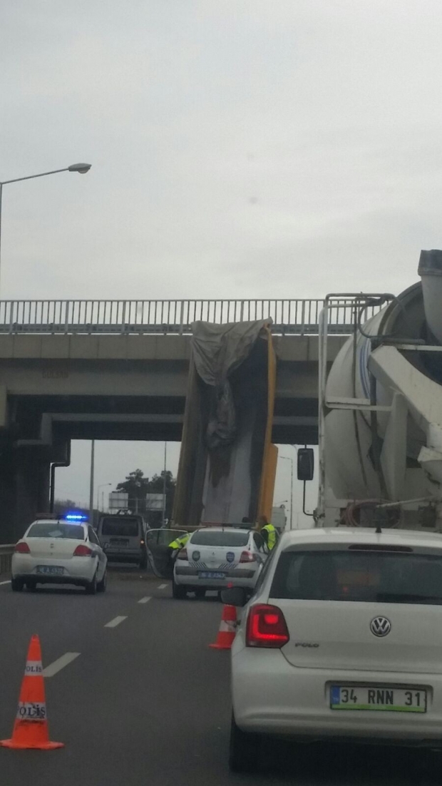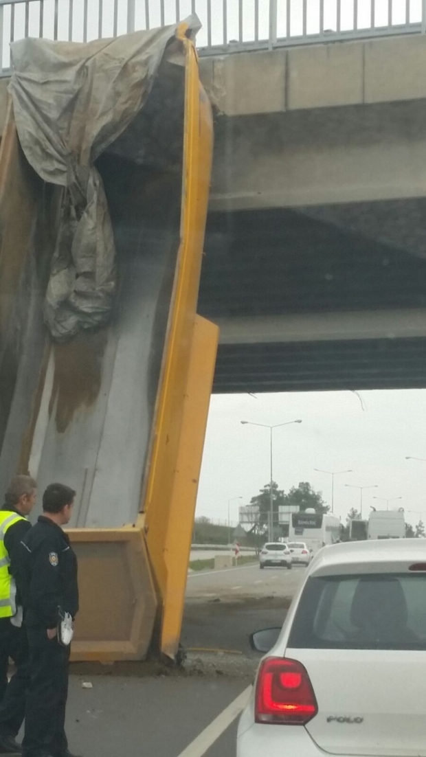 Açık olan TIR’ın damperli dorsesi, üst geçide takıldı. Bu durumu fark etmeyen şoför yola devam edince dorse TIR’dan ayrılarak üst geçitte asılı kaldı.