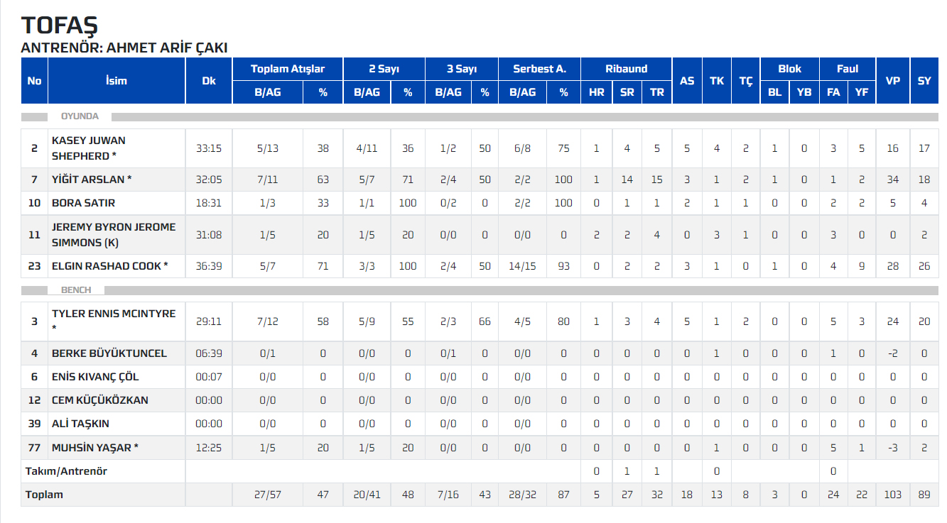 Büyükçekmece deplasmanında TOFAŞ’ta Elgin Cook 26 sayı-2 ribaund-3 asist ile takımın en skorer ismi olurken; Yiğit Arslan 18 sayı-15 ribaund-3 asist-2 top çalma ile double-double yaptı. Tyler Ennis, ilk maçında 20 sayı-4 ribaund-5 asist ile oynarken, Kasey Shepherd da 17 sayı-5 ribaund-5 asist ile katkı verdi. Sakatlıkları bulunan Emre Tanışan ve Pako Cruz karşılaşmada forma giyemedi.