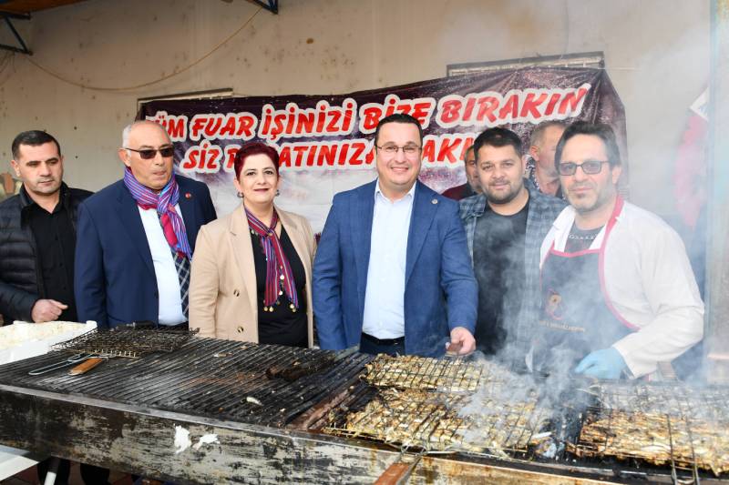 Mustafakemalpaşa Belediye Başkanı Mehmet Kanar, stantları tek tek gezerek sırada bekleyenlere hamsili ekmek dağıttı.